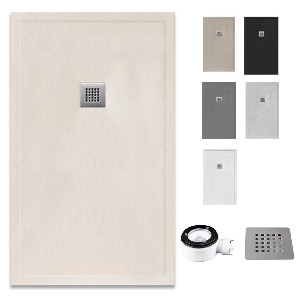 Arizona Plato de Ducha de Resina con Borde Extraplano Antideslizante Valvula y Rejilla | Textura Piedra | Beige